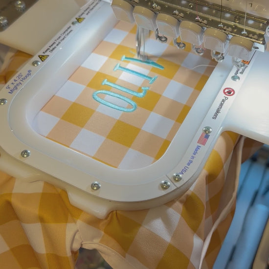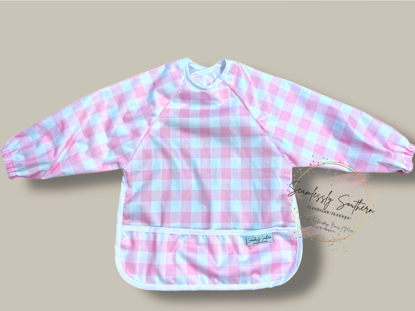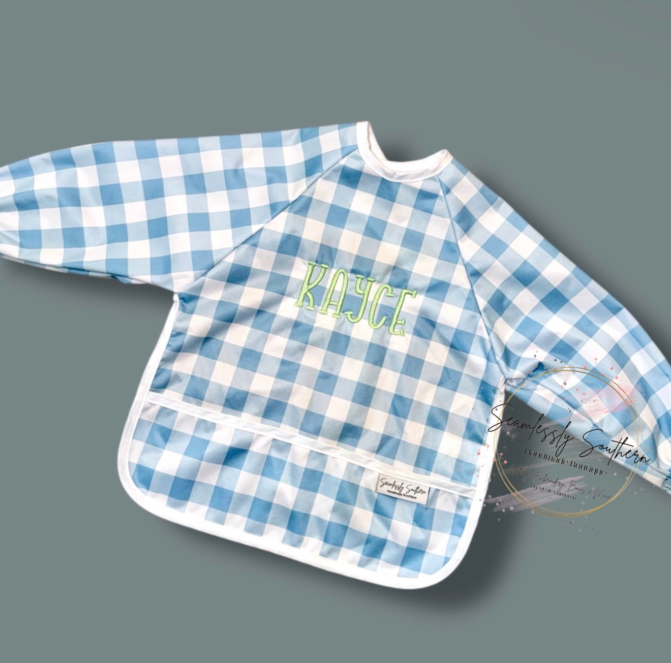 This Cover-all bib is waterproof/wipeable making eating time easier for clean up. Laundry and dryer safe but I always recommend hang drying for all my embroidered items. Back closure is a velcro attachment at the back of the neck for easy on and off.